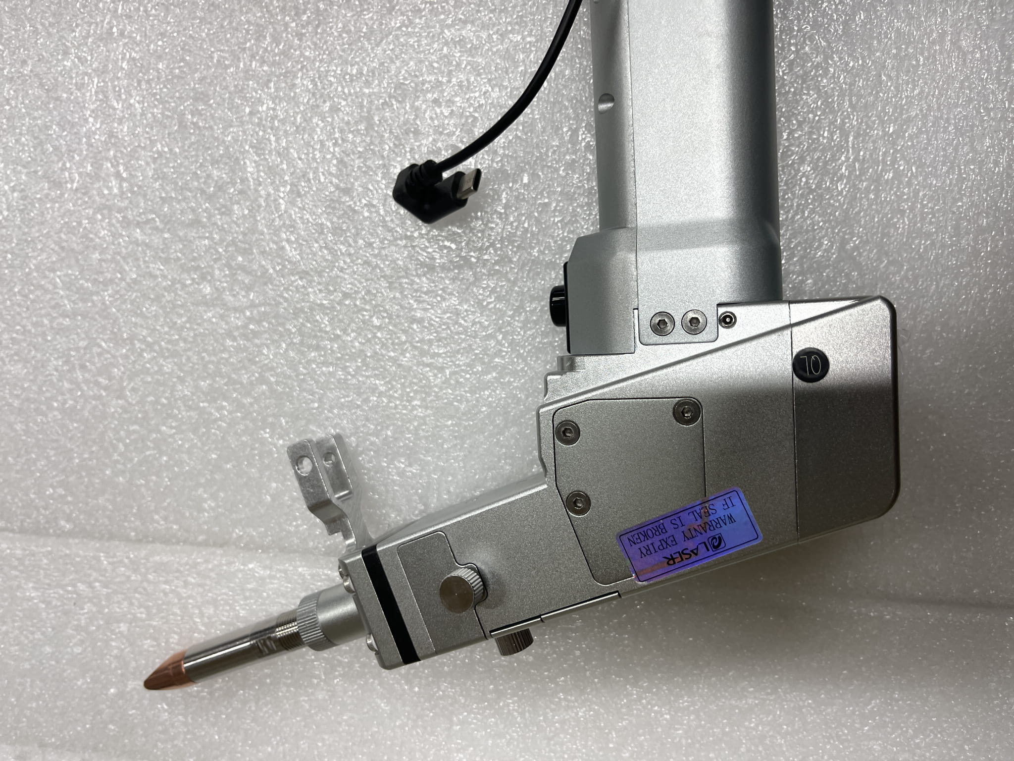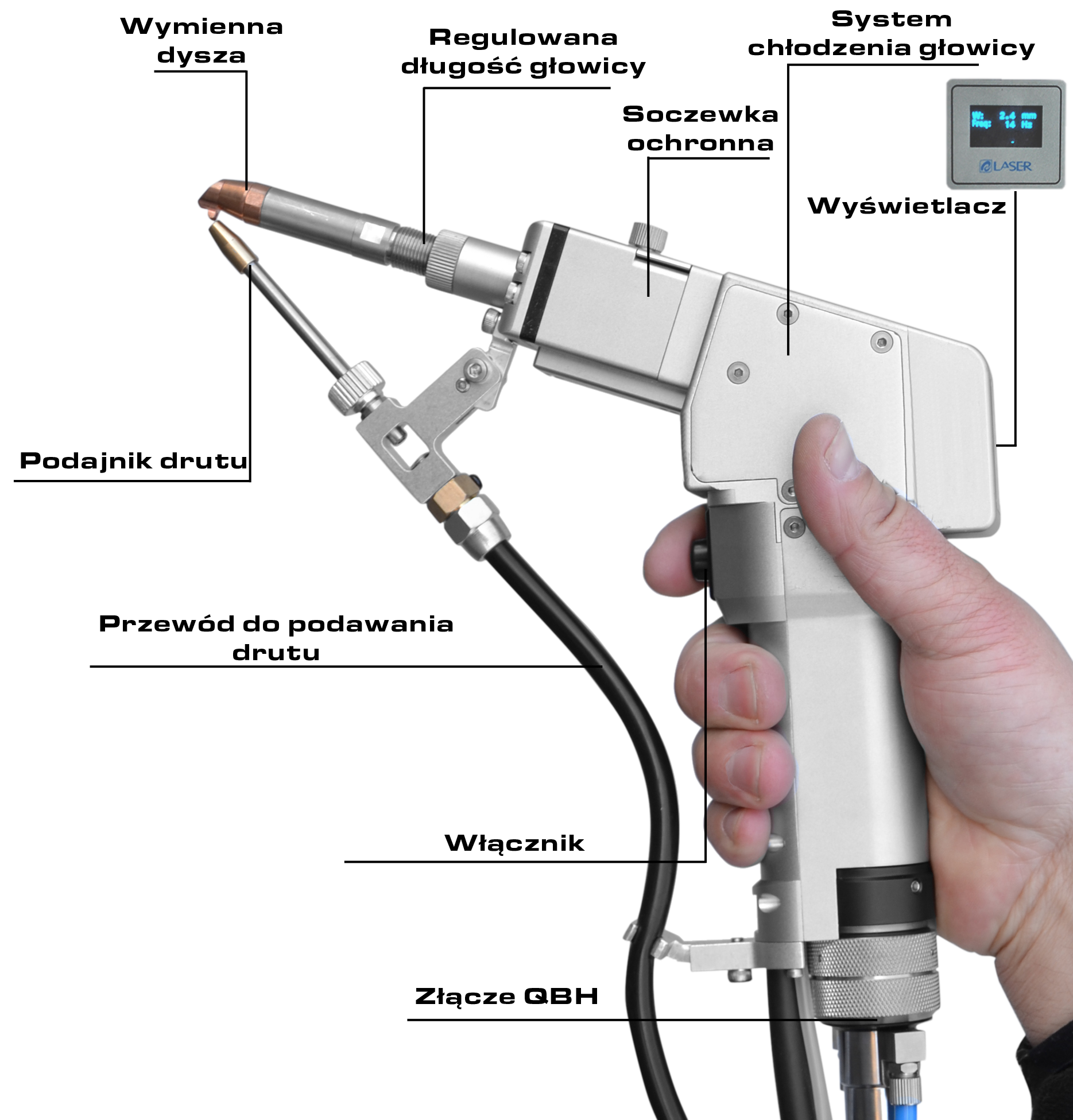 Pistolet do spawania ręcznego, który jest połączony długim światłowodem ze źródłem światła lasera oraz regulowana wartość ogniskowej umożliwia łatwą pracę w trudnych warunkach.